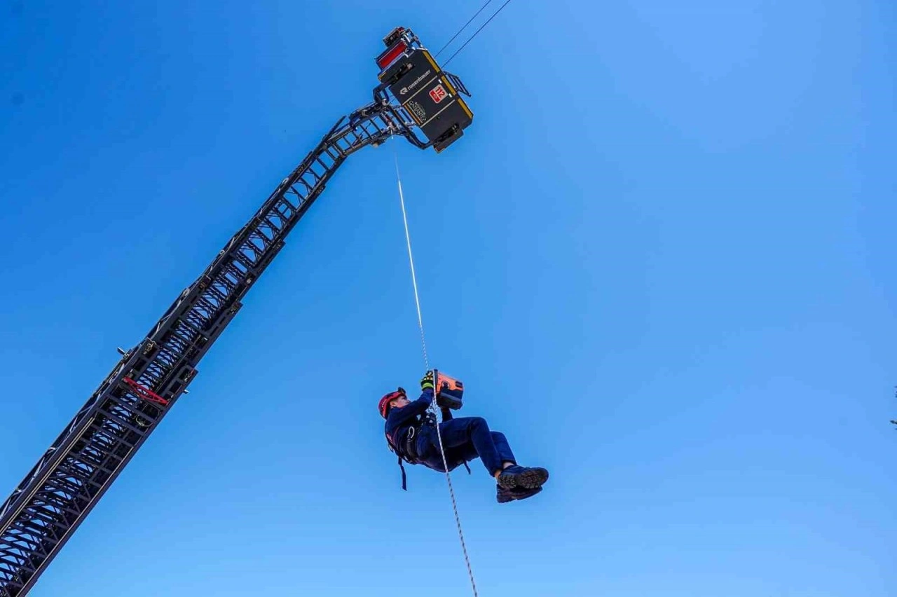 Etkinliğin ilk bölümünde, kurtarma ekibine bağlı personel yangın merdivenine kurulan özel düzenekle ip yardımıyla hızlı bir şekilde aşağı indi. İzleyenlere gerçek bir tatbikat havası yaşatan iniş sırasında personelin gösterdiği çeviklik ve disiplin dikkat çekti. Bu antrenman, kurtarma operasyonlarındaki hazırlık ve reflekslerin ne kadar önemli olduğunu bir kez daha ortaya koydu.