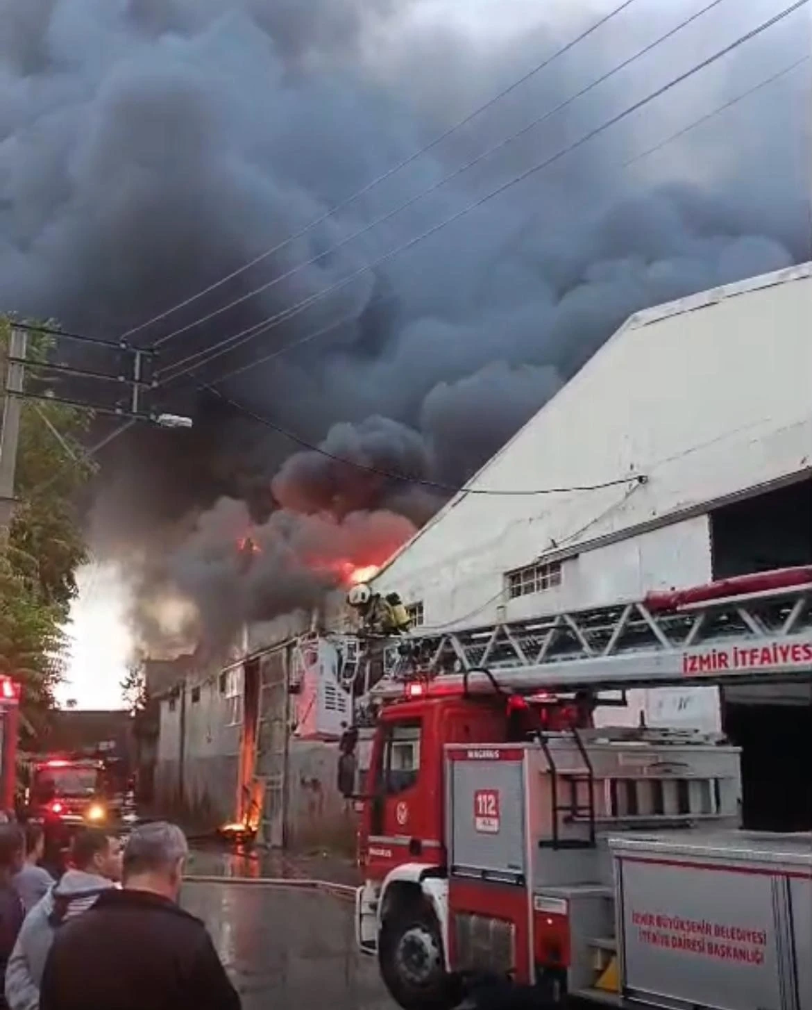 İzmir’in Bornova ilçesinde bir fabrikanın deposunda çıkan yangına itfaiye ekiplerinin müdahalesi sürüyor.
