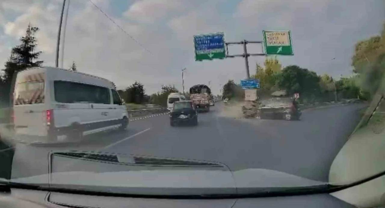 Kocaeli’nin Gebze ilçesinde ana yola bağlanmaya çalışan otomobil, kamyonetle çarpışmaktan kurtulmaya çalışırken, yol ayrımındaki demir bariyerlere girdi. O anlar araç içi kamerasına yansıdı.