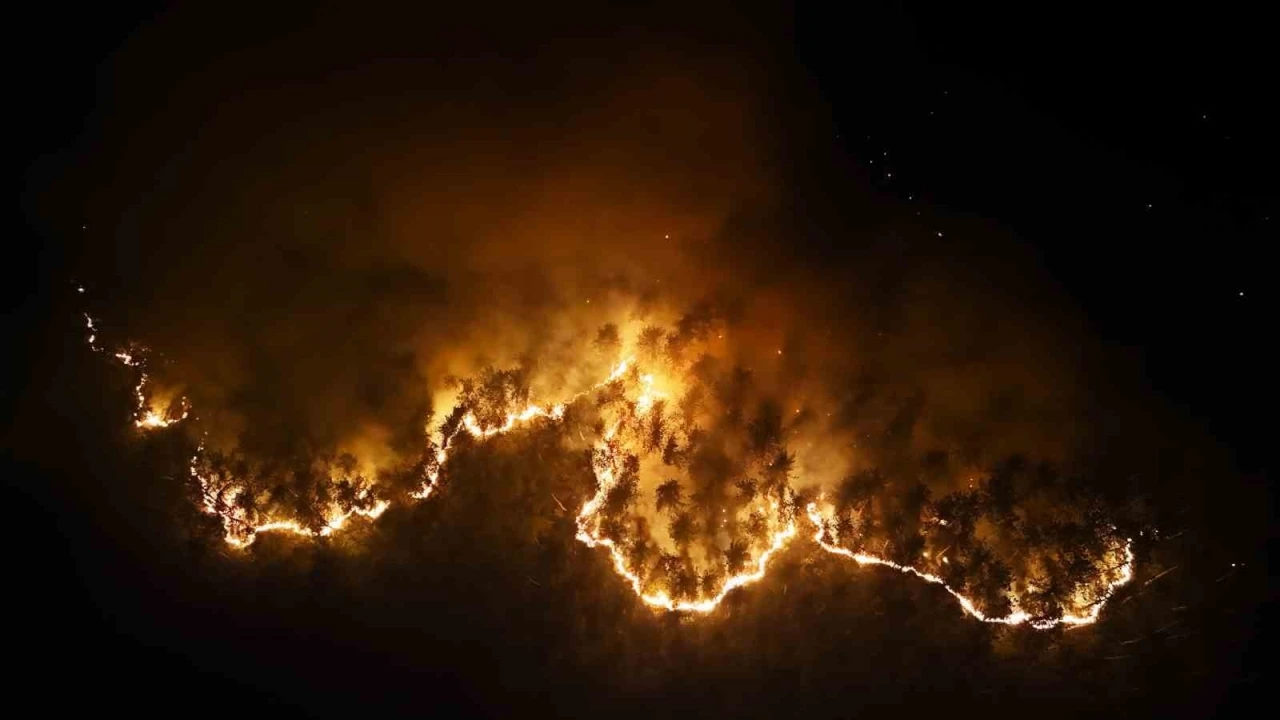 Karabük’te 12. saate girilen ve geceyi aydınlatan orman yangını dron ile görüntülenirken, ekiplerin karadan söndürme çalışmaları aralıksız devam ediyor.