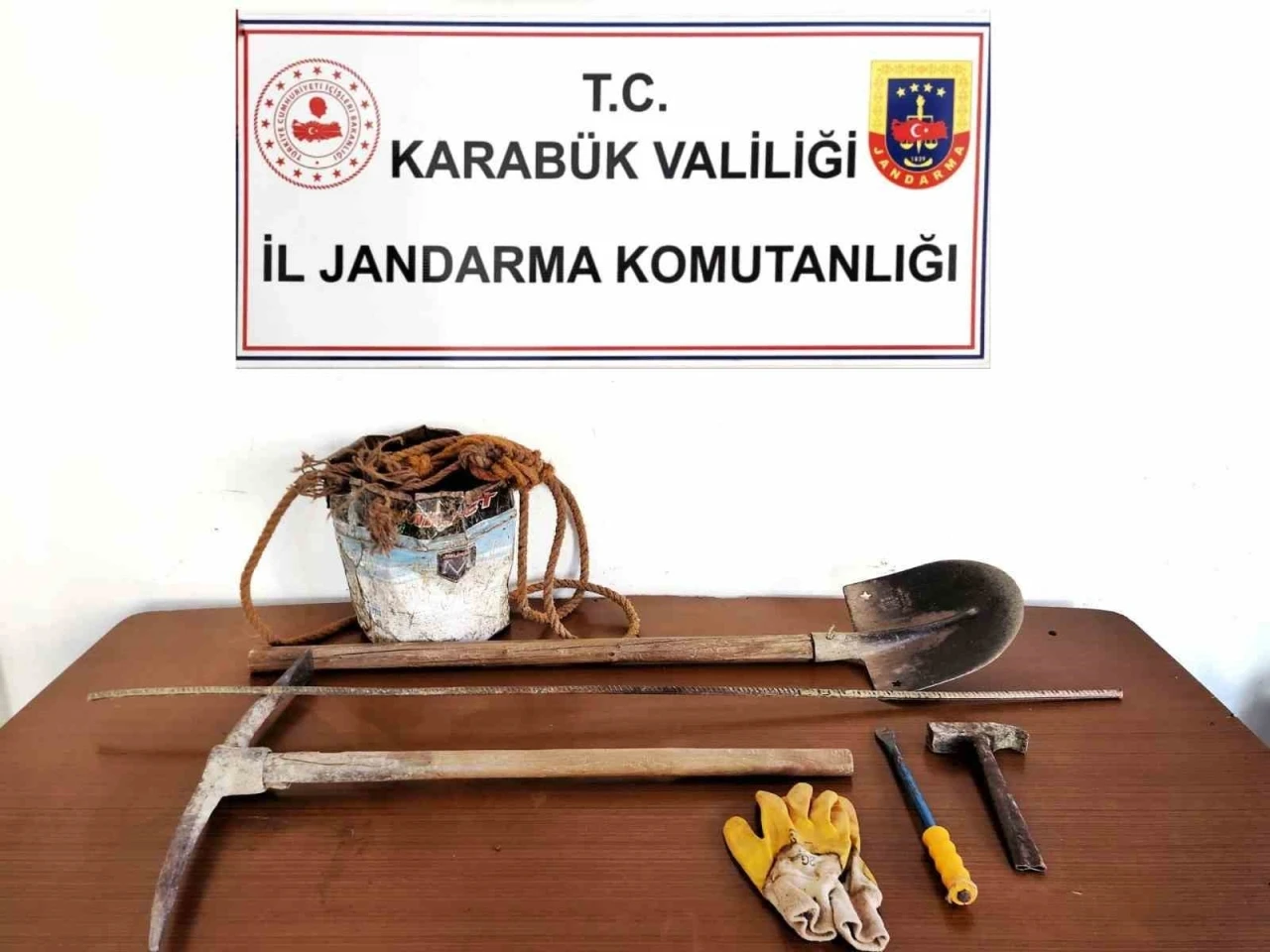 Kaçak kazıda kullanılan kazma, kürek, murç, çekiç, kova, demir çubuk, eldiven ve yaklaşık 3 metre uzunluğunda ip ele geçirildi.