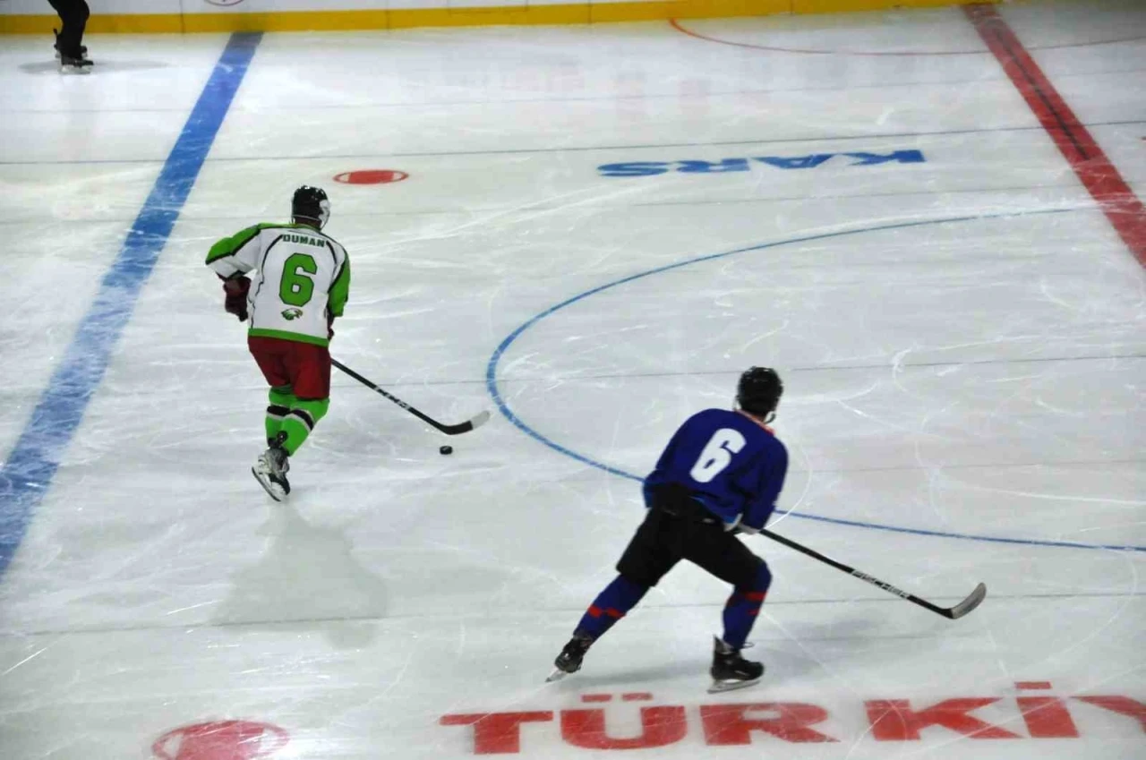 Kars'ta olimpik buz sporları salonu'nda buz hokeyi sezon açılışı maçı renkli görüntülere sahne oldu.