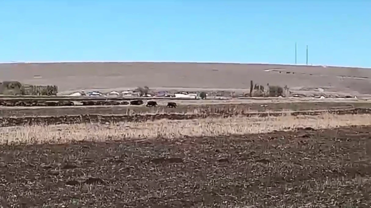 Kars’ın Akyaka ilçesine bağlı Karahan köyündeki mısır tarlarına sürüler halinde gelen domuzları gören Tokay Kurtbaş, o anları kaydederken, vatandaşları fark eden domuz sürüsü ise koşarak köyden uzaklaştı.