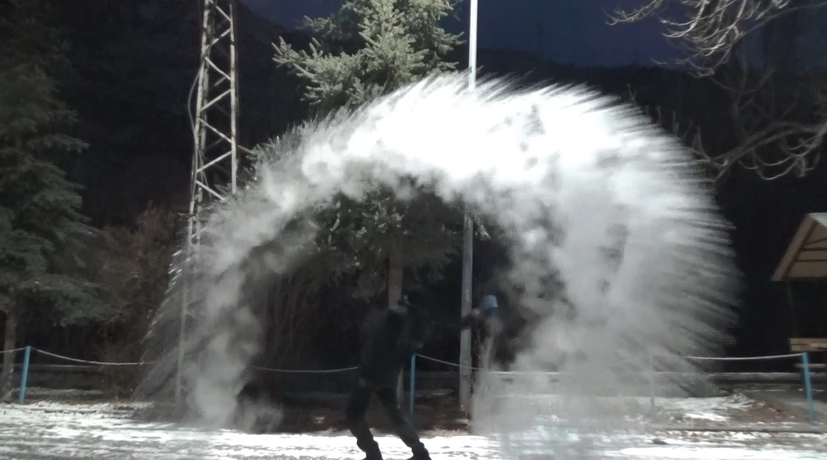 Kars’ta sibirya soğukları etkisini sürdürüyor. Vatandaşın havaya serptiği sıcak su yere düşmeden dondu(serkan erkoç/kars-iha)
