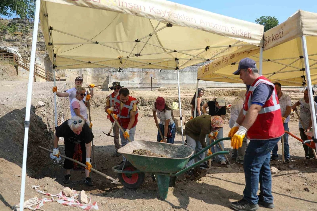 Düzce Belediyesi’nin personel ve lojistik desteği ile Kültür ve Turizm Bakanlığı’nın izni sayesinde yıl boyunca kesintisiz devam eden Konuralp Antik Tiyatro kazılarına belediye birimlerinden çalışanların gönüllü desteği sürüyor. Hafta sonu yapılan kazılarda personeli ziyaret eden Düzce Belediye Başkanı Dr. Faruk Özlü, çalışmaya katkı veren belediye çalışanlarının geleceğe matuf bir eserde emekleri olduğuna dikkat çekti.