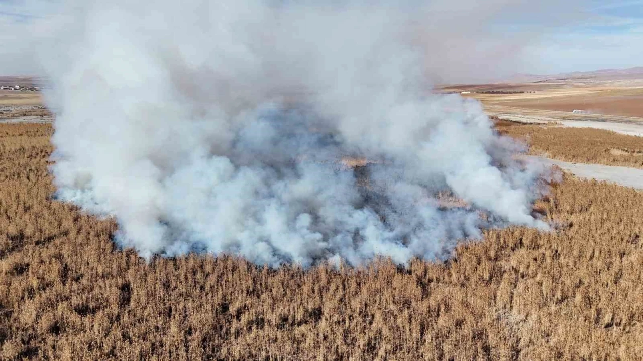 Konya'nın kulu ilçesinde bulunan ve kuraklığın vurduğu kuş cenneti'nde dün başlayan sazlık yangını devam ederken, yanan alan havadan görüntülendi.