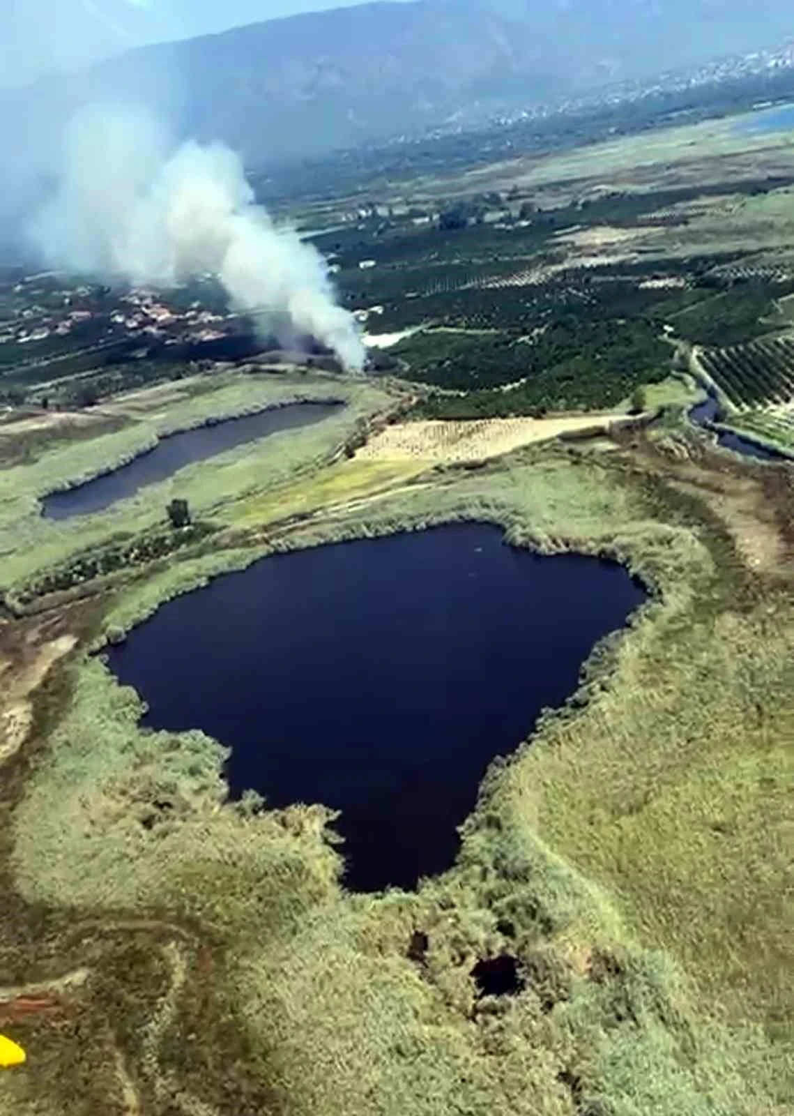 Muğla’nın köyceğiz ilçesinde öğle saatlerinde sazlık alanda başlayan yangına ekiplerin müdahalesi devam ediyor.