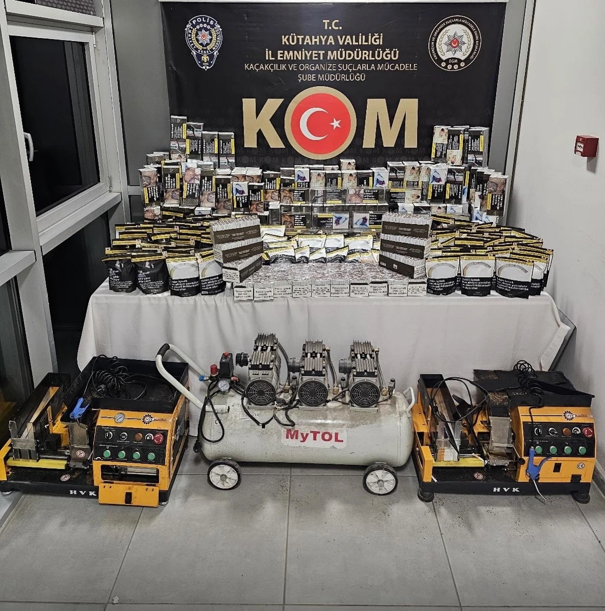 Bu kapsamda, kaçak sigara ve tütün imalatı yapıldığı tespit edilen bir adrese düzenlenen operasyonda yapılan aramalarda; 2 adet sigara sarma makinesi, sigara sarımında kullanılan 1 adet kompresör, 13 kilo 900 gram tütün, 34 bin 900 adet boş ve dolu makaron ele geçirildi.