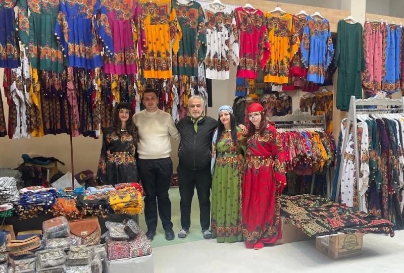 Mardin Mezopotamya Yöresel elbise ve çocuk giyimlerinin sahibi Mehmet Demir, hem tanıtım hem de satış yaptı.
