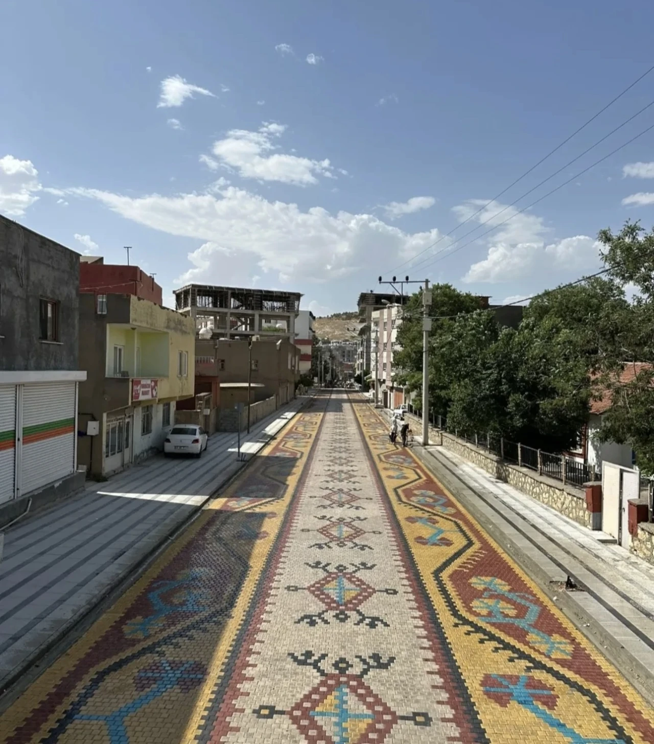 Mazıdağı belediyesi ilçe merkezinde bulunan çiğdem caddesi'ne 11 milyon 368 bin tl'ye halı desenli yol yaptı