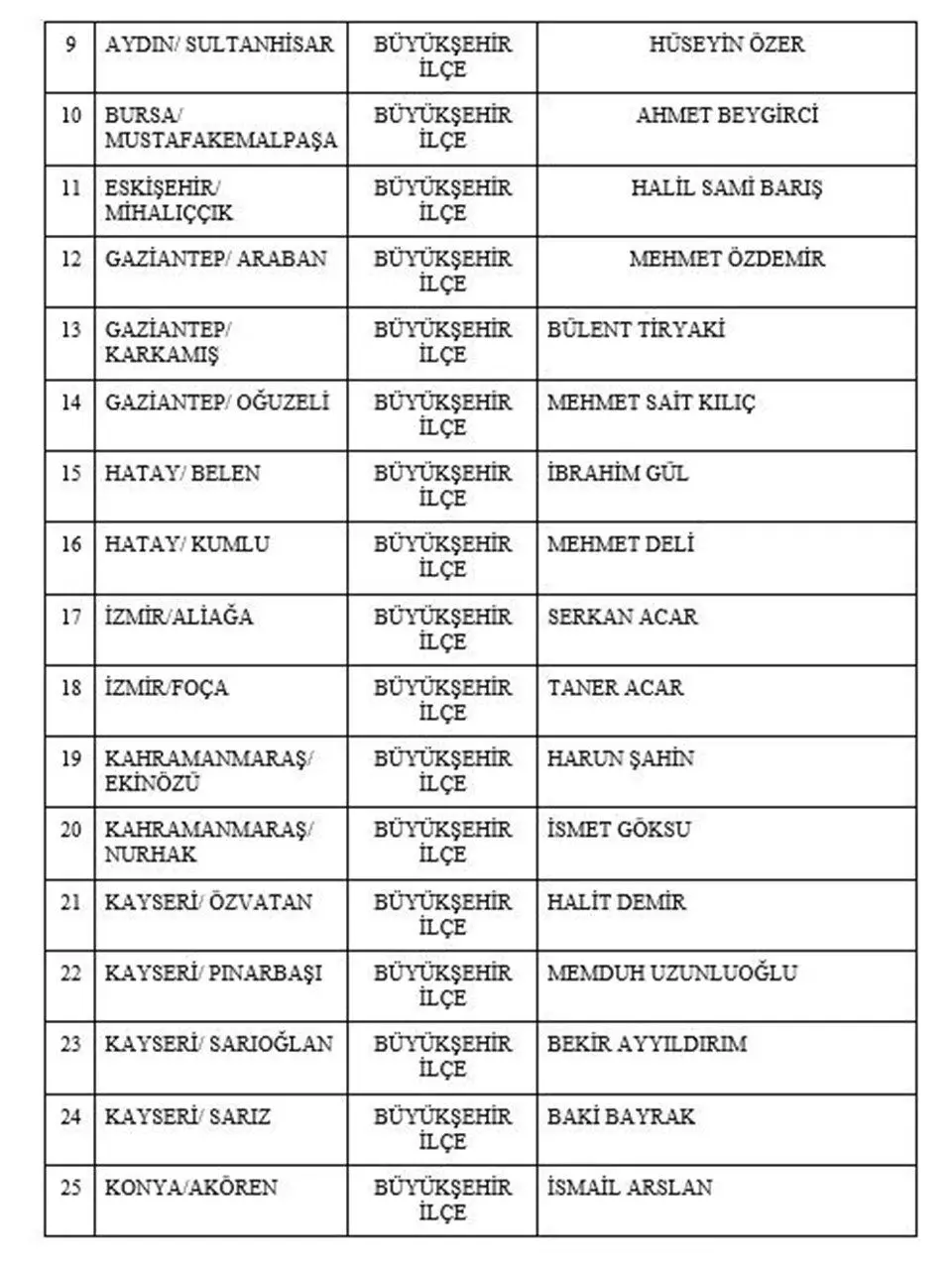 Milliyetçi Hareket Partisi (MHP), 31 Mart'ta yapılacak yerel seçimlerde 2 büyükşehir, 12 il ve 41 büyükşehir ilçe belediye başkan adayını açıkladı.