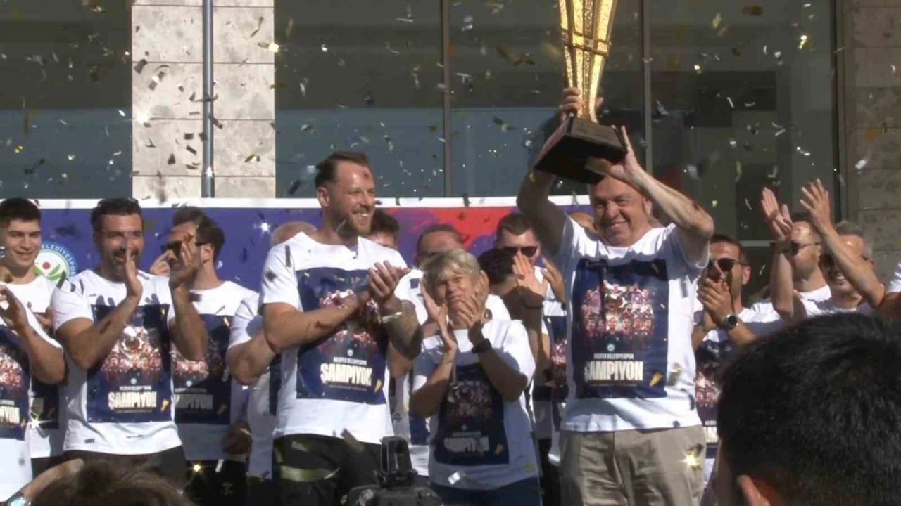 Tören sırasında Başkan Özdemir, takımın kadın başantrenörü İlknur Kurtuluş’a çiçek takdim ederek, tarihi başarısından dolayı tebrik etti. Ardından oyuncuları tek tek kutlayıp hediye verdi.