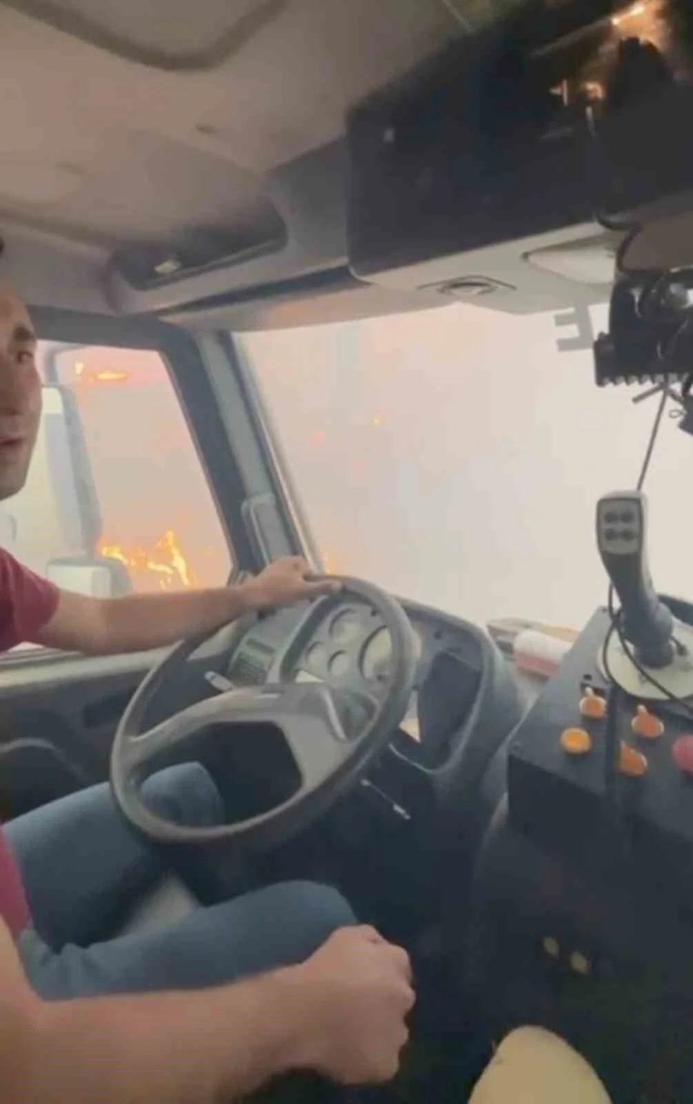 Çanakkale’nin Ezine ilçesinde çıkan orman yangınına Orman Bölge Müdürlüğü ekipleri havadan ve karadan müdahale ediyor. Bu sırada alevlerin arasında kalan bir arazözdeki orman işçileri, o zor anları cep telefonu kameralarıyla kaydetti.