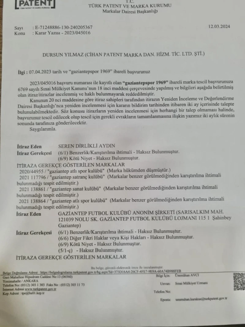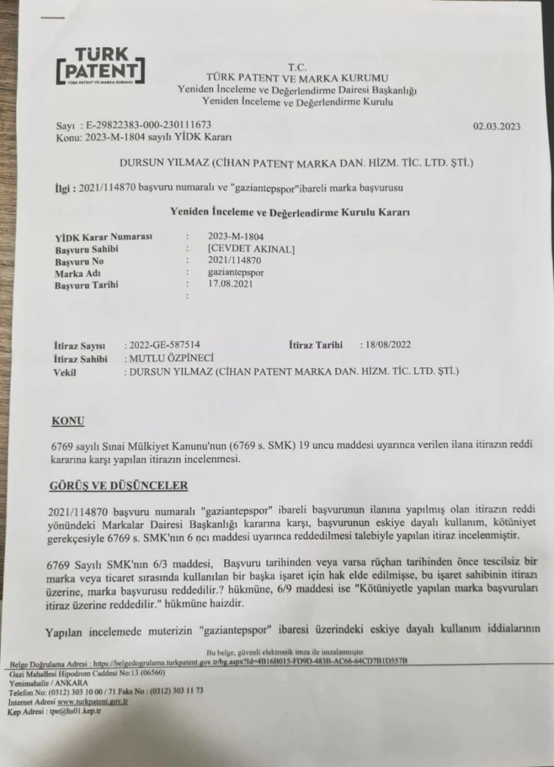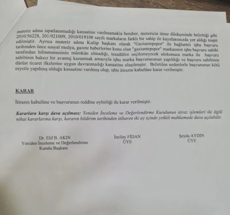 Gaziantepspor Başkanı Mutlu Özpineci, mahkeme kararı sonrasında Marka Tescilden Gaziantepspor ismini ve logosunu aldı. Bu kararın içerisinde ise tüm sportif faaliyetlerde ismi Mutlu Özpineci'nin kullanabileceği öğrenildi.