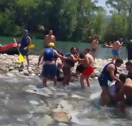 Antalya’da bir rafting merkezinde can yeleği giymeyen bir grup ile kendilerine yelek giymeleri konusunda uyarak grup arasında kavga çıktı.