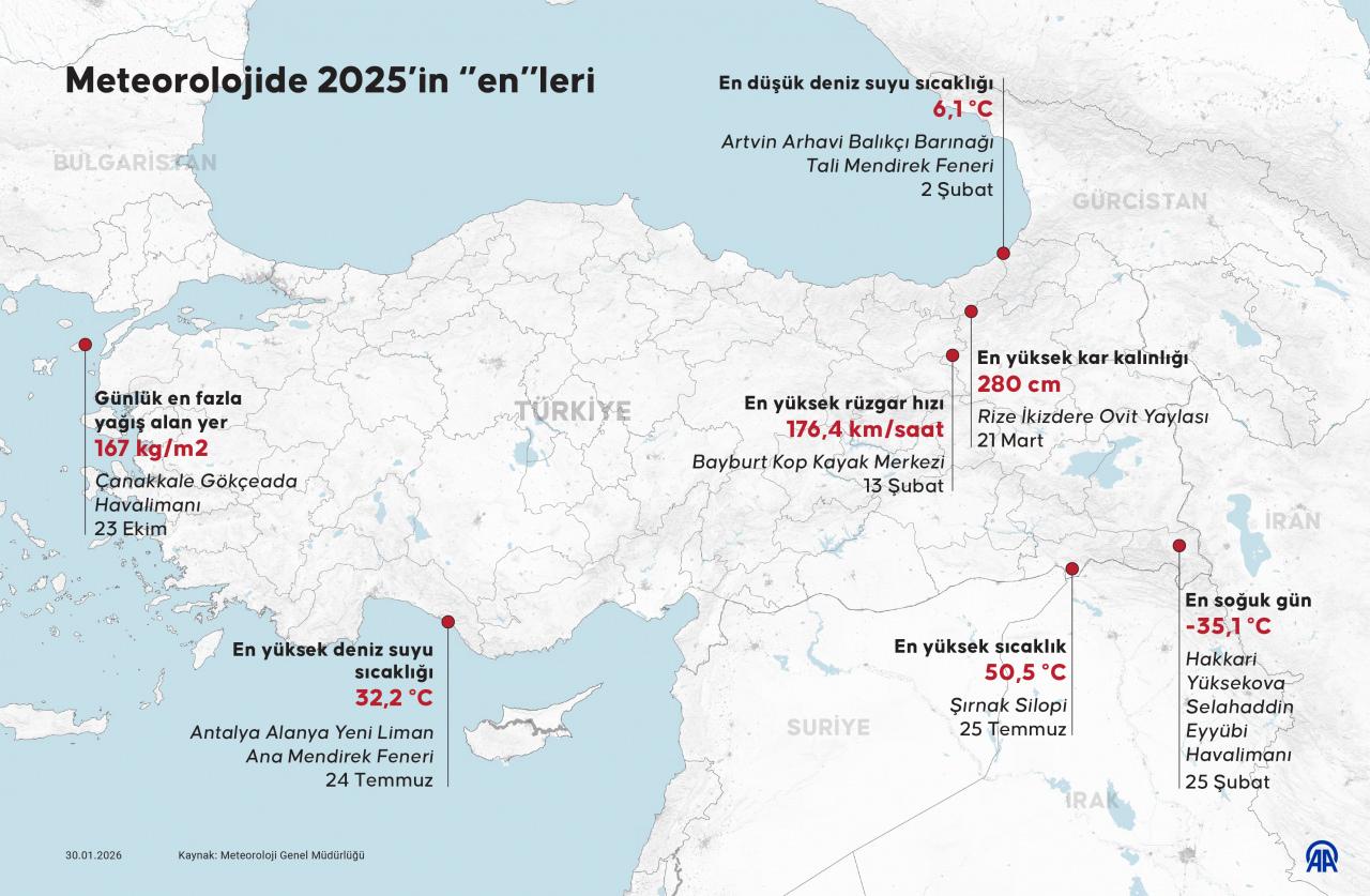 Bu kapsamda, 2025 yılının en sıcak günü 25 Temmuz'da 50,5 dereceyle Şırnak'ın Silopi ilçesinde, en soğuk günü ise 25 Şubat'ta sıfırın altında 35,1 dereceyle Hakkari'nin Yüksekova ilçesindeki Selahaddin Eyyübi Havalimanı'nda kayıtlara geçti.