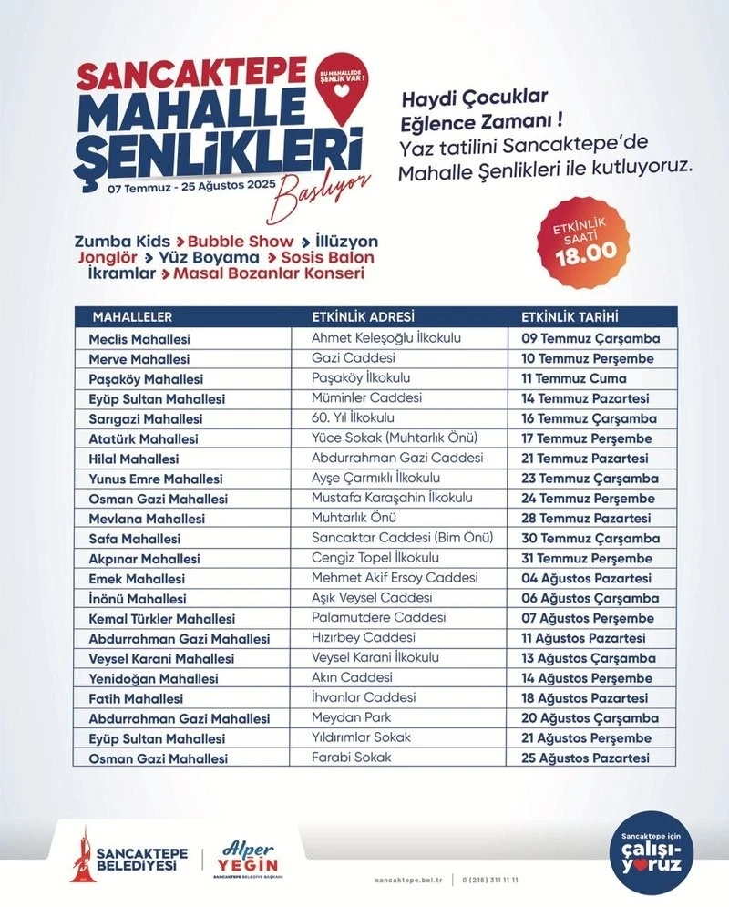 Sancaktepe Belediyesi tarafından düzenlenen mahalle şenlikleri başladı. 9 Temmuz tarihinde Meclis Mahallesi’nde gerçekleşen ve mahalle halkının yoğun katılım gösterdiği şenliklerde yapılan gösteriler, izleyicilere keyifli anlar yaşattı. Şenliklerde illüzyon gösterileri, zumba kids, bubble şov, jonklör ve palyaço gösterileri, başta çocuklar olmak üzere katılımcılar tarafından büyük ilgiyle izlendi. Çeşitli ikramların olduğu şenliklerde sahne gösterilerinin ardından düzenlenen açık hava sinemasında vatandaşlar keyifli zaman geçirdi.