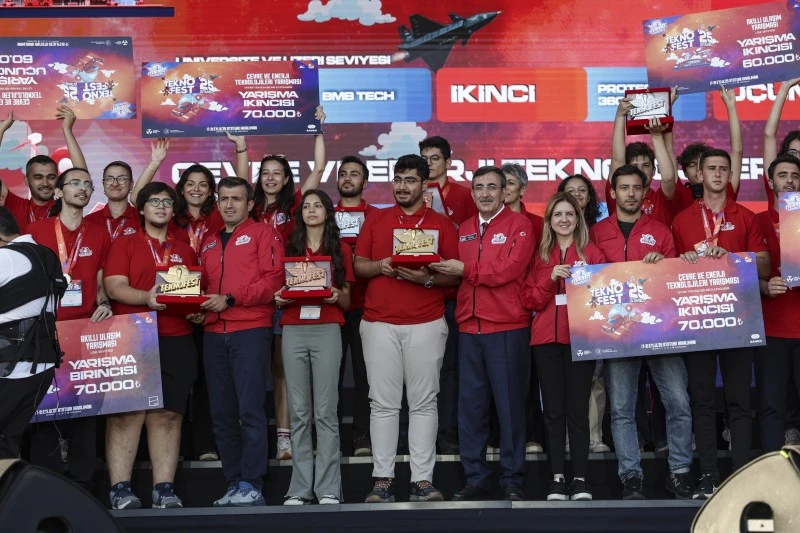 Dereceye giren öğrencilere ödülleri Cumhurbaşkanı Yardımcısı Cevdet Yılmaz, TEKNOFEST Yönetim Kurulu ve T3 Vakfı Mütevelli Heyeti Başkanı Selçuk Bayraktar ile SANKO Holding Kurumsal İletişim Direktörü Pınar Ulutaş İsen takdim etti.
