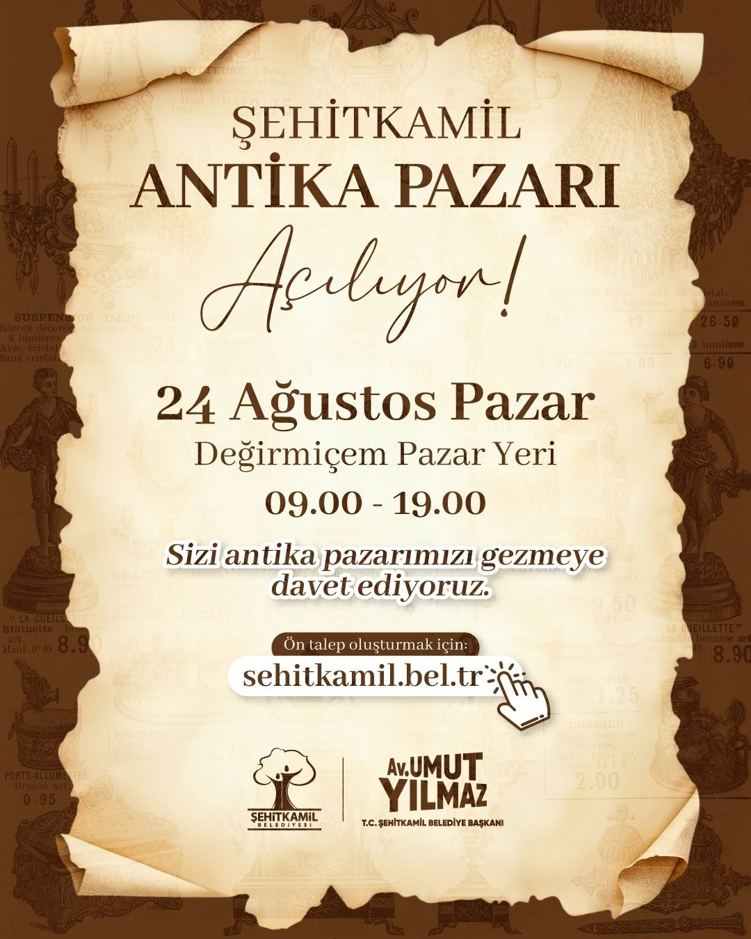 Şehitkamil Belediye Başkanı Umut Yılmaz’ın duyurusunu yaptığı Şehitkamil Antika Pazarı, bu hafta kapılarını açıyor. Eski zamanların ruhunu taşıyan eşsiz parçalar ve koleksiyonluk objelerin yer alacağı pazara antika tutkunlarını bir araya getirecek.