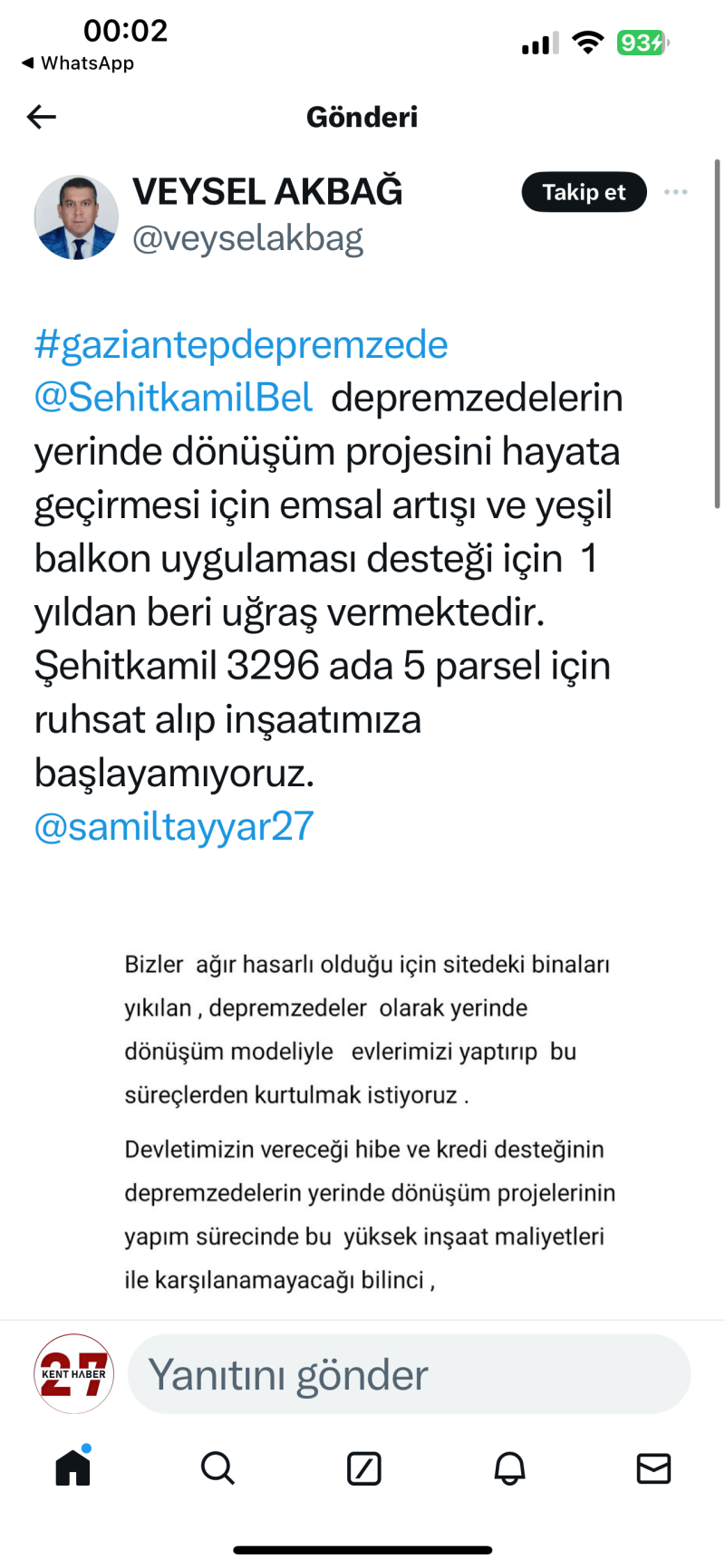 Şehitkamil Bölgesi’ndeki Olimpik Yüzme Havuzu karşısındaki sitede ikamet ederken 6 Şubat depremlerinden oturduğu bina ağır hasar alan site sakini Veysel Akbağ, sosyal medya hesabından konuya ilişkin yaptığı açıklamada; “Bizler depremzedeler olarak evlerimizi yerinden dönüşüm kapsamında yeniden inşa etmek etmek ve süreçten bir an önce kurtulmak istiyoruz. Devletin vereceği hibe ve kredi yerinde dönüşüm kapsamında maliyetleri karşılamayacak. Şehitkamil Belediyesi, depremzedelerin yerinde dönüşüm ile bir an evvel projelerini faaliyete geçirmeleri amacıyla 1.20 emsal artış katsayısı ve yüzde 20 yeşil balkon uygulanası konularında meclis kararları aldı. Bu alınan karar riskli yapılarda emsal 1.50 katına alınabilir ve 6306 sayılı kanuna bu uygundur. Bu meclis kararının uygulanmasını bekliyoruz” ifadelerine yer verdi.