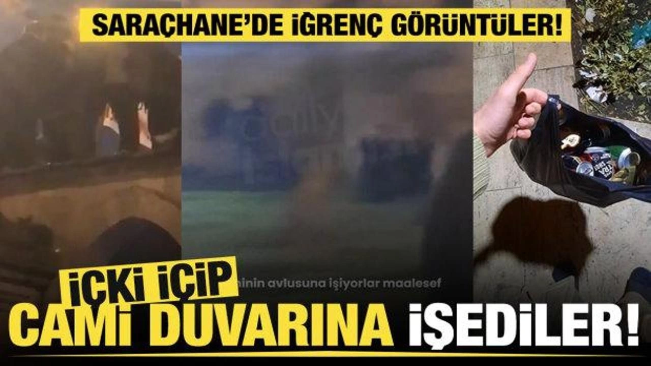 Şehzadebaşı Camii bahçesinde alkol alan göstericiler, cami duvarına pislerken görüntülendi.