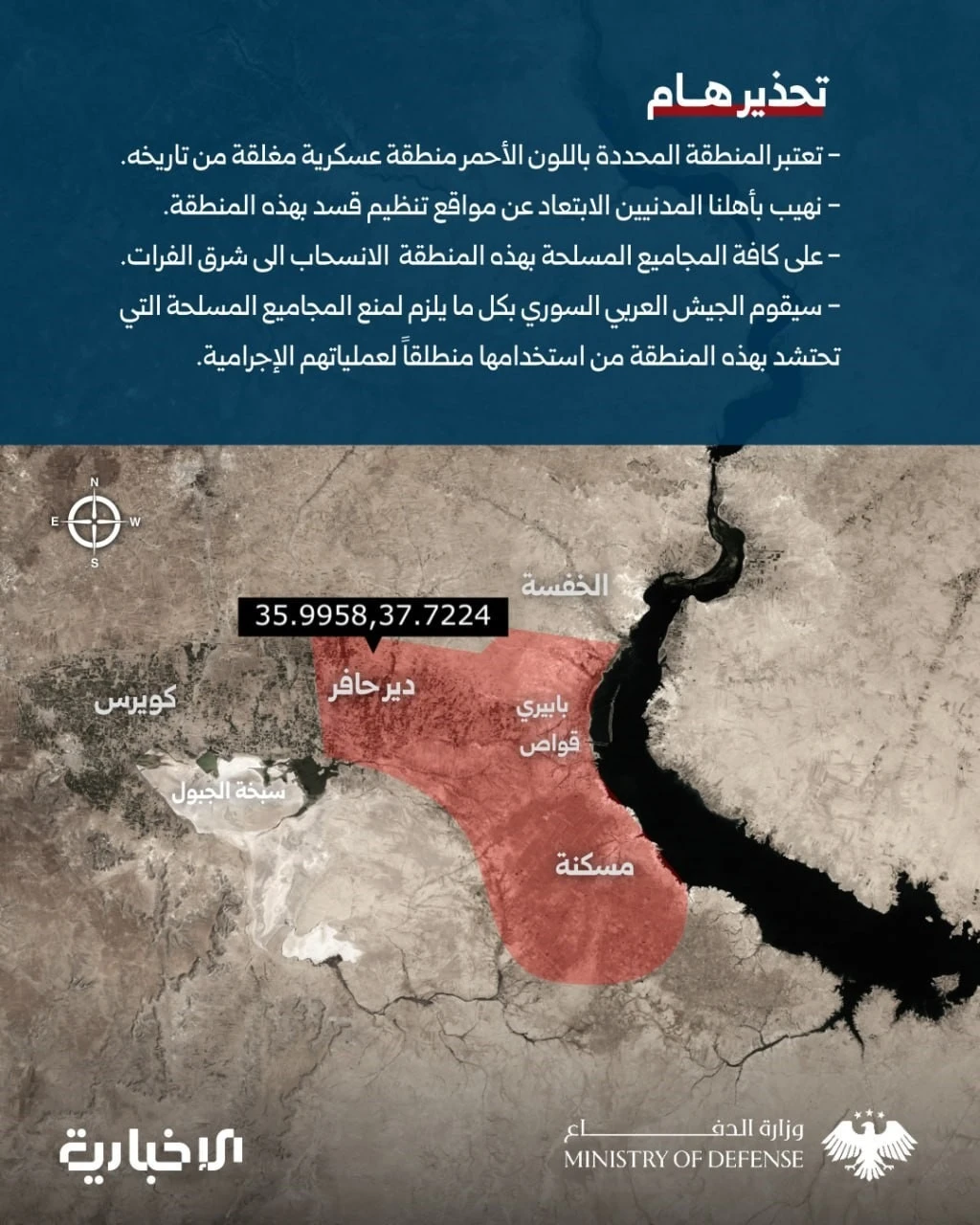 Suriye ordusundan yapılan yazılı açıklamada, SDG ve PKK’lı teröristlerin ve eski rejim unsurlarının Fırat Nehri’nin batısında yığınak yapmaya devam ettiği belirtildi. Söz konusu bölgenin Halep’e yönelik saldırılarda İran yapımı kamikaze İHA’ların fırlatma noktası olarak kullanıldığı belirtildi. Açıklamada, "Bu bölgelerde SDG’nin PKK’lı teröristlerle ve eski rejimin kalıntılarıyla birlikte yığınağını arttırması ve bu bölgelerin Halep’e yönelik İran yapımı kamikaze İHA’ların fırlatma noktası olması nedeniyle Fırat Nehri’nin batısında yer alan kırmızı işaretlenmiş bölgeler askeri bölge ilan edilmiştir. Bu bölgedeki tüm silahlı gruplar Fırat Nehri’nin doğusuna çekilmelidir" ifadeleri kullanıldı. Sivillere söz konusu bölgedeki SDG mevzilerinden uzak durma çağrısı yapılarak, "Suriye ordusu, bu bölgede toplanan silahlı grupların burayı suç faaliyetleri için üs olarak kullanmasını engellemek için gerekli her şeyi yapacaktır" denildi.