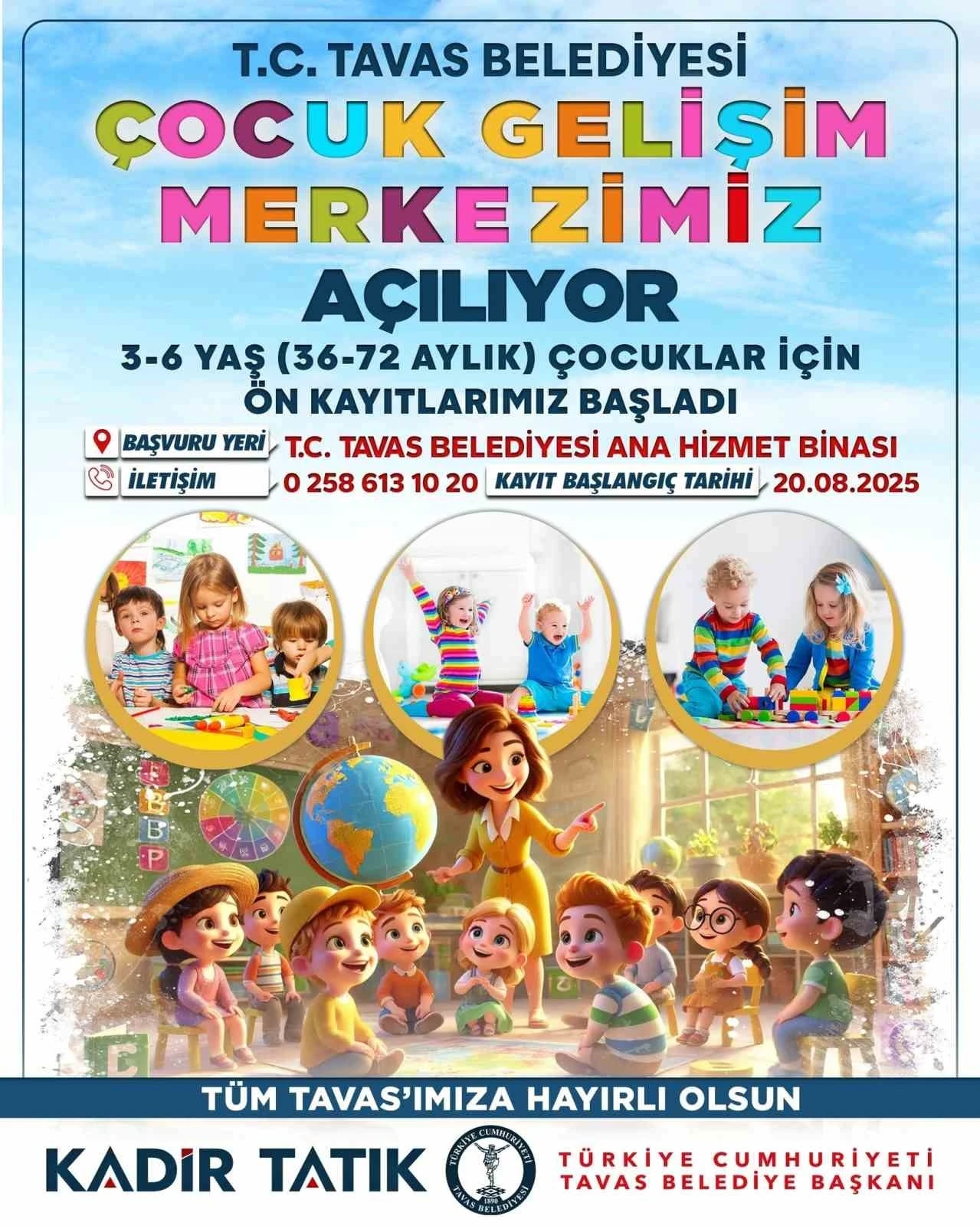 Tavas Belediyesi tarafından yakın zamanda hizmete başlayacak olan Çocuk Gelişim Merkezi için 3 ile 6 yaş arası çocuk kayıtları başladı. Çalışan ailelerin çocuklarını güvenli ortama emanet etmeleri amacıyla Tavas Belediyesi tarafından Çocuk Gelişim Merkezi açılıyor. Tavas Çocuk Gelişim Merkezi çocukların güvenli, modern ve sevgi dolu bir ortamda gelişimlerini desteklemek amacıyla; sanat ve yaratıcılık atölyeleri, erken çocukluk eğitim programları, oyun, spor ve hareket etkinlikleri, müzik ve ritim çalışmaları gibi zengin içerikli eğitim programları ile hizmet verecek. Yakın zamanda hizmet vermeye başlayacak olan Gelişim Merkezi için 3 ile 6 yaş arası çocuklar için ön kayır 20 Ağustos 2025 Çarşamba günü itibariyle başladı. Kayıt yaptırmak isteyen vatandaşların Tavas Belediyesi Hizmet Binasındaki ilgili birime giderek başvuru yapmaları gerekiyor. Gelişim Merkezi için kayıt süresinin başladığını sosyal medya üzerinden duyuran Tavas Belediye Başkanı Kadir, "Geleceğimizin teminatı çocuklarımız için en güzel adımları atmaya devam ediyoruz. Çocuklarımızın güvenli, modern ve sevgi dolu bir ortamda gelişimlerini desteklemek için tam donanımlı Tavas Çocuk Gelişim Merkezini hizmete açıyoruz" ifadelerini kullandı.