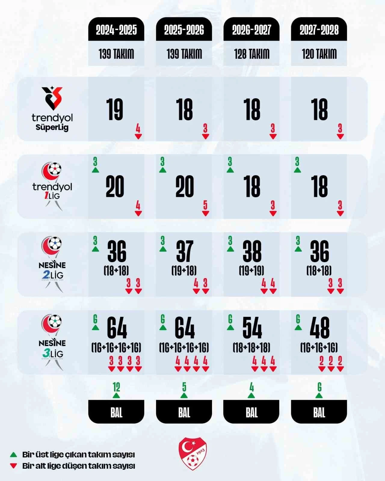 2025-2026 sezonu itibarıyla takım sayısının kademeli olarak azaltılmasına gidilecek ve halihazırda 139 olan profesyonel takım sayısı, düşme ve çıkma sayılarına göre 120’ye düşürülecek.