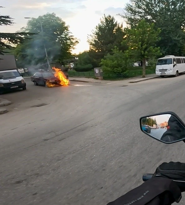 Eskişehir’de Tofaş marka aracın alev alev yanma anı, oradan geçen bir motosiklet kullanıcısının kask kamerasına yansıdı.