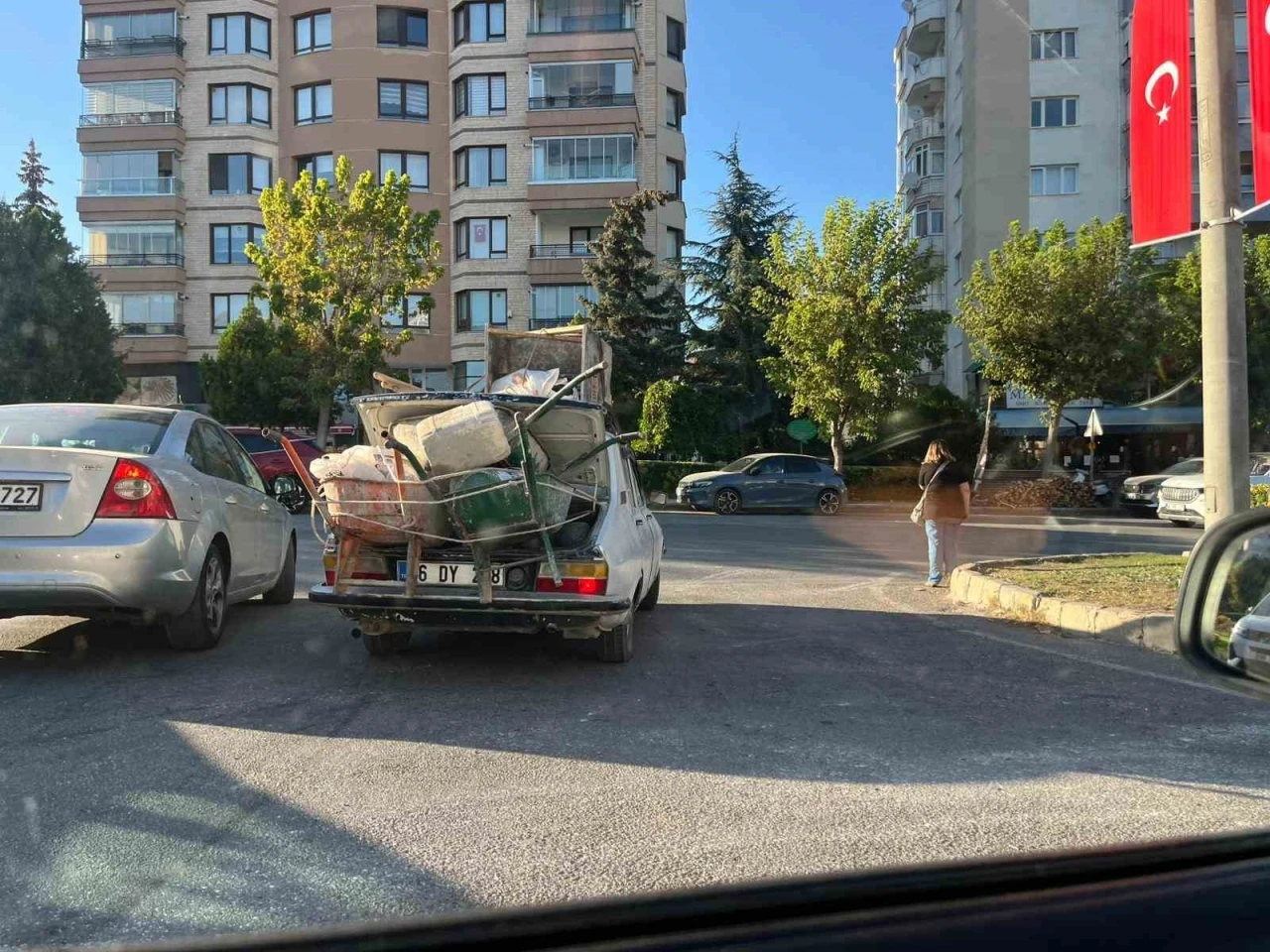 Vişnelik Mahallesi Atatürk Bulvarı’nda seyir halinde bulunan bir otomobil dikkat çekti. Sürücü, aracın bagaj kapısını kapatmayarak içerisine, dışarı taşacak şekilde el arabaları gibi birçok inşaat malzemesi koyup tavanına ise demir bir malzeme yerleştirdi. Bunları iple bağlayıp bu şekilde trafiğe çıkan sürücü, hem kendini, hem de diğer araçları ve sürücüleri riske attı. Ortaya çıkan bu görüntü ’pes’ dedirtirken, muhtemel bir faciaya ise kapı araladı.