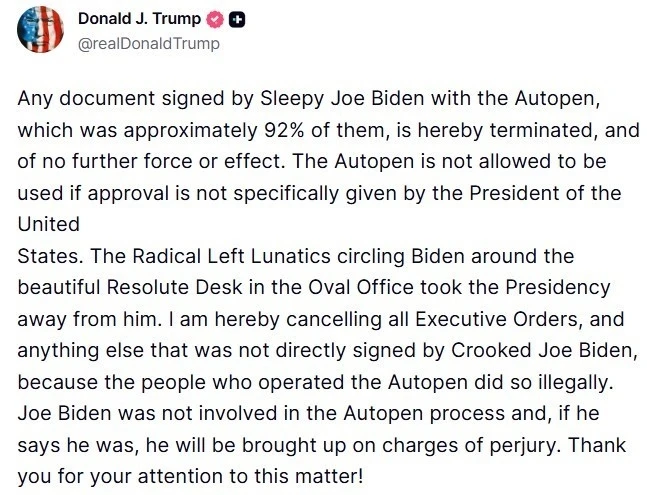 Bu nedenle o dönemde imzalanan tüm resmi belgeleri geçersiz kıldığını söyleyen Trump, "Sahtekar Joe Biden tarafından doğrudan imzalanmamış tüm başkanlık kararnamelerini ve resmi belgeleri iptal ediyorum. Çünkü ‘Autopen’i kullanan kişiler bunu yasadışı bir şekilde yapmıştır" dedi. Biden’ın resmi başkanlık belgelerinin "Autopen" ile imzalandığı sürece dahil olmadığının altını çizen Trump, "Eğer dahil olduğunu söylerse, yalancı şahitlik suçlamasıyla karşı karşıya kalacaktır" uyarısında bulundu.