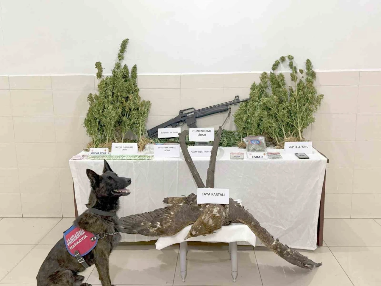 Tunceli’de jandarma tarafından yapılan uyuşturucu operasyonunda çok sayıda ve miktarda uyuşturucu maddenin yanı sıra kaçak avlanan kaya kartalı trofesi ve dağ keçisi boynuzu ele geçirildi.