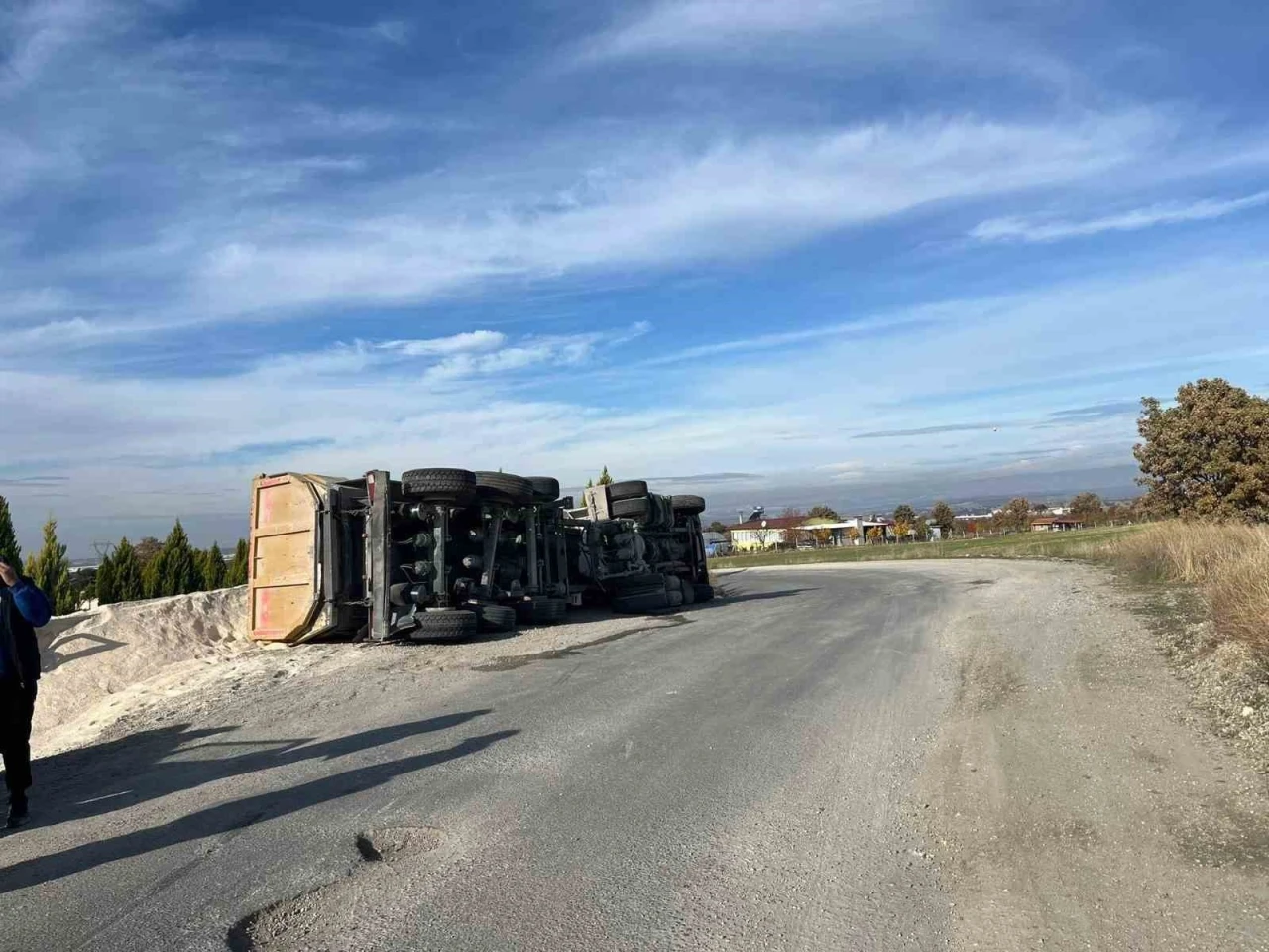 Uşak’ta yan yatan tırın sürücüsü yaralanarak hastaneye kaldırıldı.