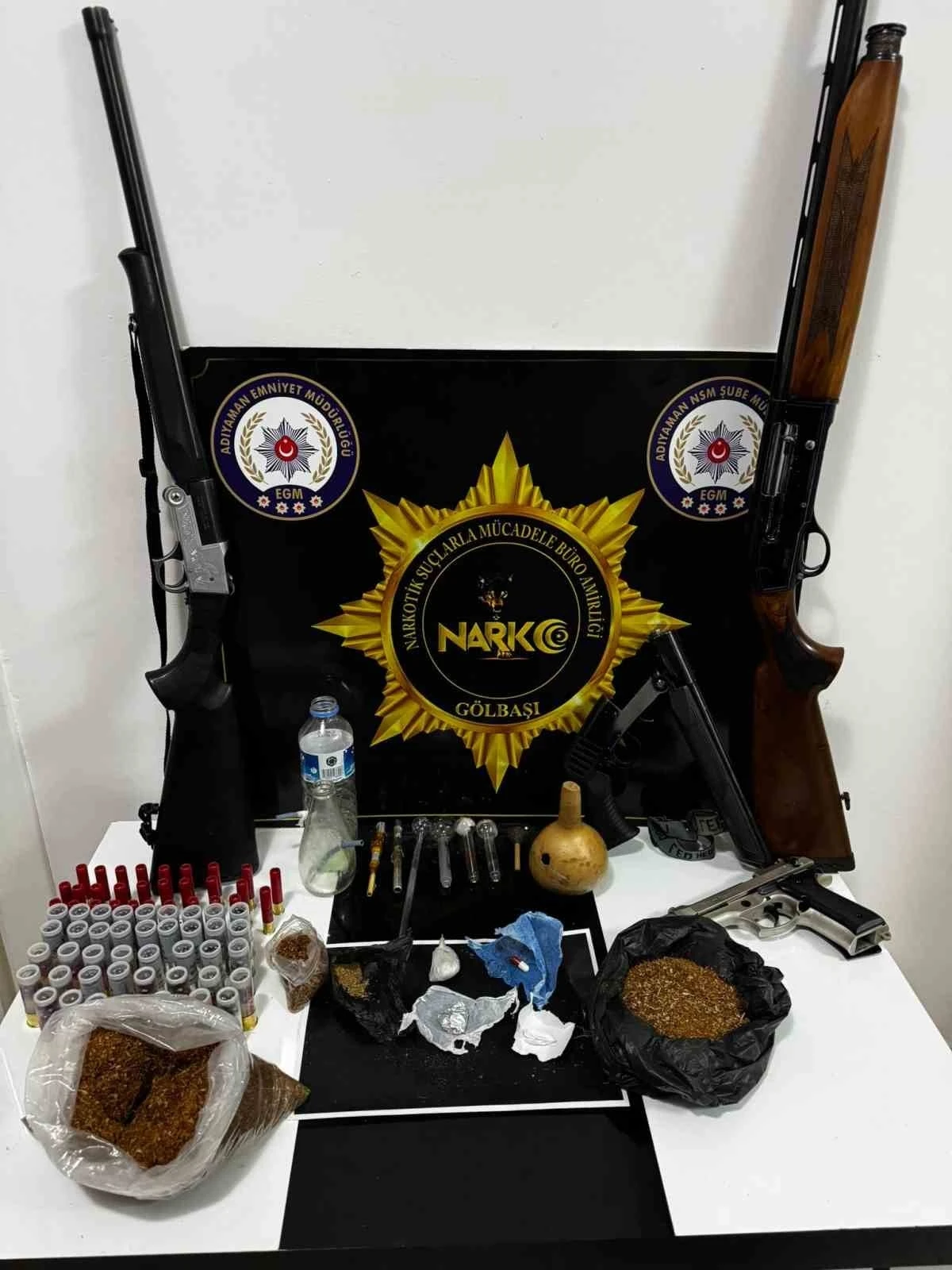 Adıyaman’ın gölbaşı ilçesinde düzenlenen operasyonda uyuşturucu madde, silah ve fişek ele geçirildi, 3 kişi gözaltına alındı.