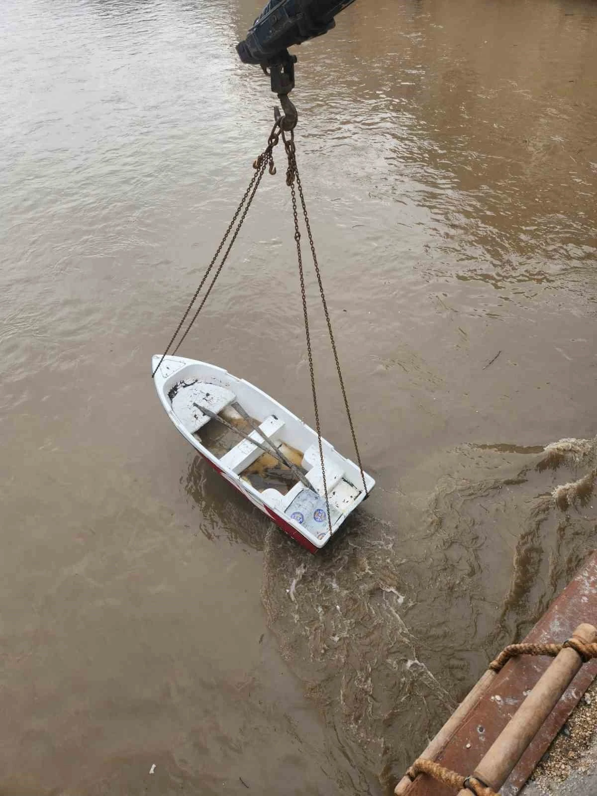 Amasya’da debisi yükselen Yeşilırmak Nehri’nde köprü ayağına takılan kayık vinç yardımıyla çıkartıldı.