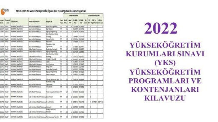 ÖSYM genellikle YKS sonuçlarının açıklanmasının ardından 1 hafta içerisinde üniversite tercih işlemlerini başlatıyor. Tercih kılavuzu ise öğrencilerin, yoğun tercih dönemi öncesinde fikir oluşturması açısından erkenden yayınlanıyor. YKS tercih kılavuzunda ön lisans ve lisans üniversitelerin taban puanları, kontenjanları ve başarı sıralamaları yer almaktadır.