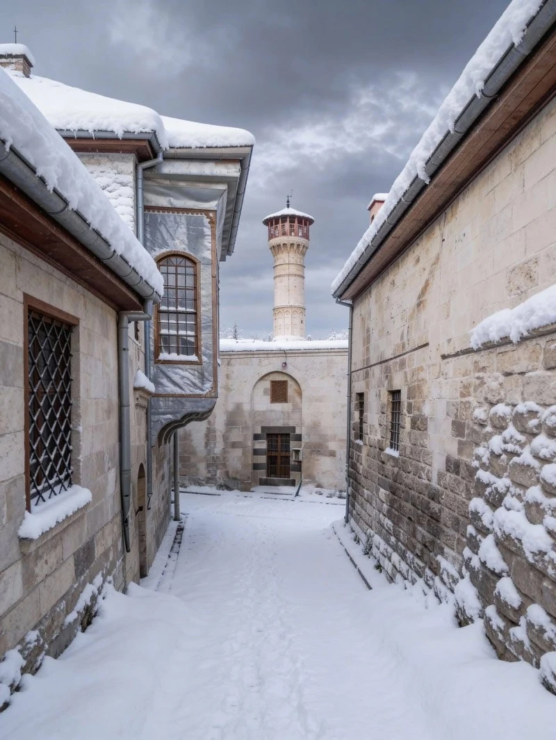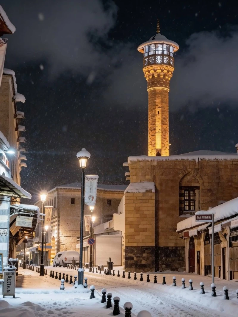 Tarihin izlerini taşıyan hanlar, camiler ve dar sokaklar karla birlikte adeta yeniden canlandı.
