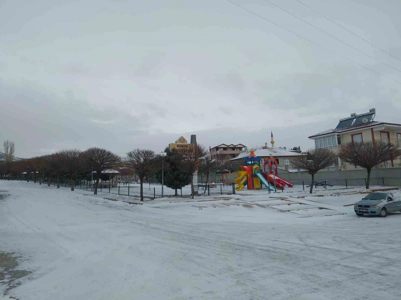 Konya’nın Yunak ilçesinde mevsimin ilk karı yağdı, ilçe beyaza büründü.