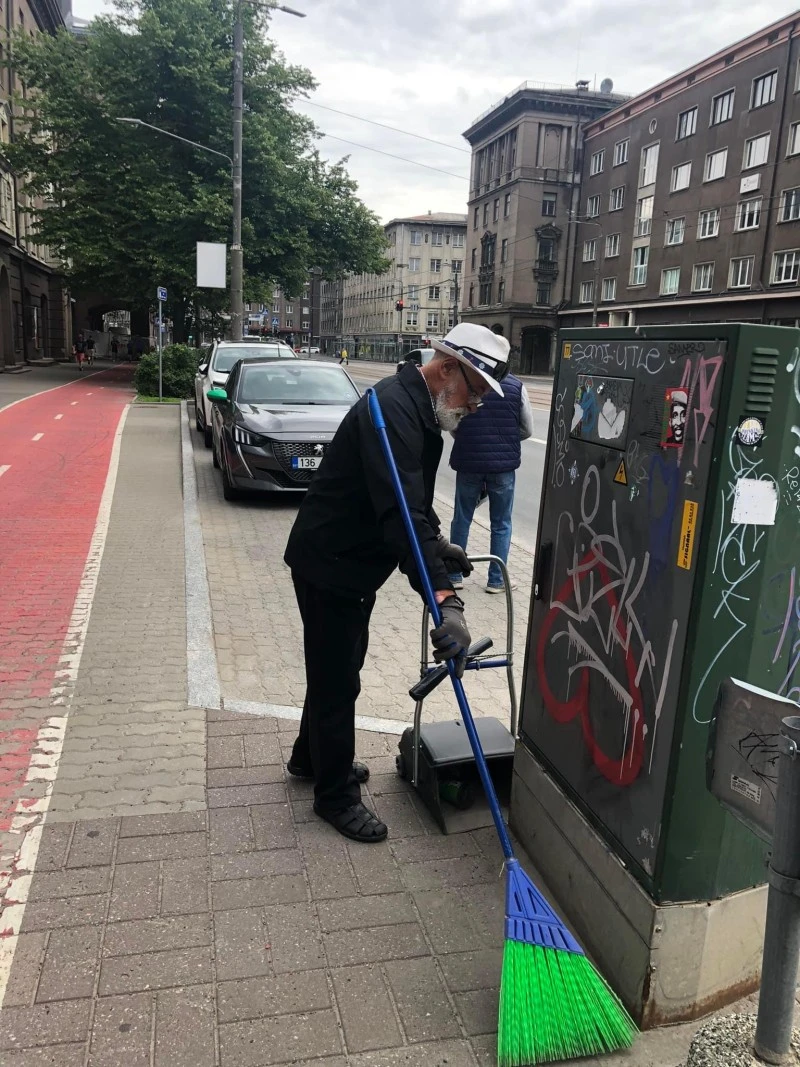 Resimde ki sosyal dernek mensubu emekli birisi gönüllü olarak, boş zamanlarında şehrin temizliğine katkı sağlıyor